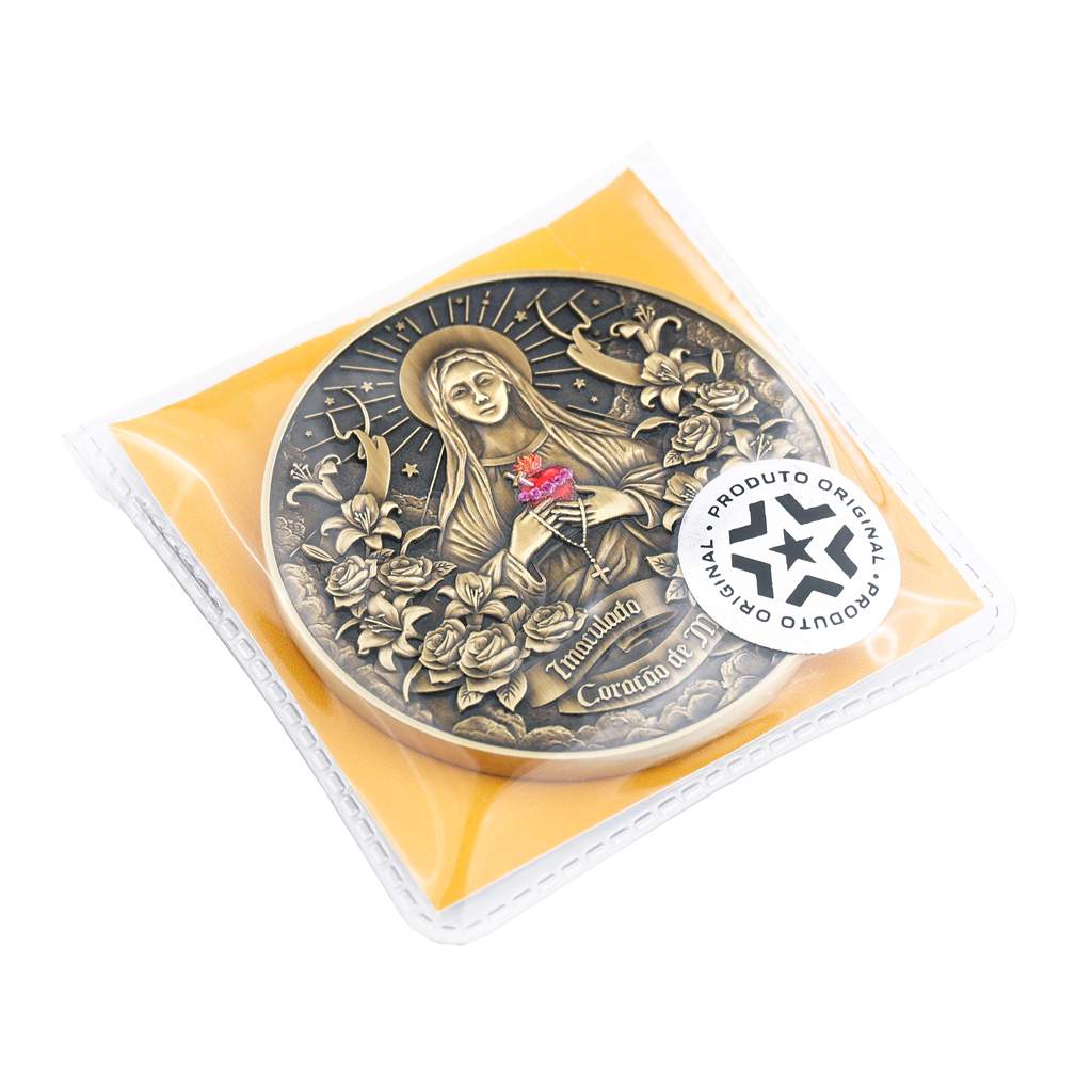 Nesta medalha, cada elemento foi cuidadosamente esculpido para transmitir fé e devoção: as chamas do amor divino que nunca se apagam, as flores que representam a pureza imaculada, e a espada que recorda o sacrifício silencioso e a dor redentora que Maria suportou por todos nós.